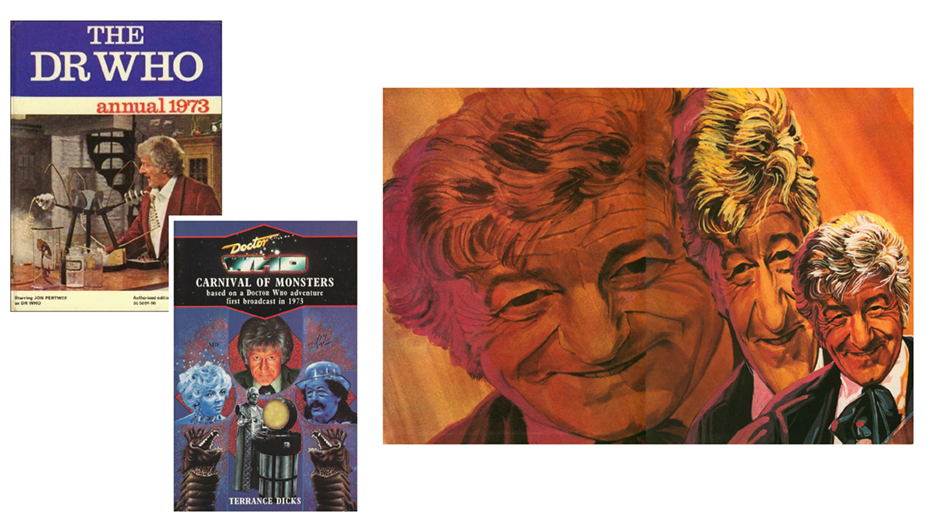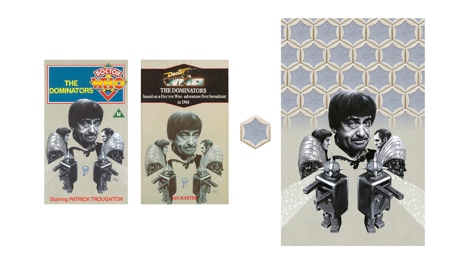 The idea behind this project was to use the cover of The Doctor Who Annual 1969 (World Distributors) as inspiration to create a new image which captured the flavour of that era’s style. Initially the brief was simply to add a background image of the TARDIS walls to the inner circle behind him, but it soon became clear to Alister that the hat was placed slightly too high on the Doctor’s head, so he asked me to move it down a few millimetres to make it look more natural. I tackled this part of the project first, using a mock-up from Alister and some extra painted regions of the brim ย on the master painting to find the new position. Some work on the joins where it met the edges of the hair, along with some additional shadow under the brim, completed the repair. The creation of the TARDIS wall involved a few stages. I sourced a section of the roundel design from a publicity photo, and used sections from other roundels in the image to restore and create a new master roundel. I then tiled it into a wallpaper pattern to match the original set design. The new TARDIS wall was coloured red sampled from the 1969 Annual’s cover and added to the master portrait. Finally, it was warped to match the perspective of the 1969 painting and cropped to match Alister’s chosen angle and position. An inner white circle and outer red circle completed the composition, and the bottom corner of the bow tie was cloned to peek over the boundary of the circle. Doctor Who – Time-Flight (WH Allen & Coย / Target Booksย 1983)ย was the second novelisation featuring Peter Davison’s Doctor, and has the unusual distinction of being one of only two of his stories not to receive fully painted cover illustrations (the other being Doctor Who – Terminus;ย see below for more information about that one). Davison and his agent had been unhappy with the illustration painted for Doctor Who and the Visitation (WH Allen & Coย / Target Booksย 1982), so WH Allen’s management took the decision to use photographs on Fifth Doctor stories from that title onwards. These photo covers were unanimously unpopular with the readership, and the practice was eventually abandoned in early 1984, after eleven books. The final two* – Snakedance and Enlightenmentย – did have traditional paintings, but a photo of the Doctor was weaved into the series logo so they sort of count in the tally of photo covers. When Virgin Publishing began a programme of reprints in 1990 seven of these photo covers were replaced with new paintings by Alister, the “blue spine reprints” (or BSR for short). These editions were published in monthly batches of two: Castrovalvaย andย Four To Doomsday, Kindaย andย The Visitation (1991), and Arc of Infinityย and Mawdryn Undead, andย Earthshockย (1992, the latter being issued with The Awakening). The reprints were very successful, but sales eventually tailed off and the list came to an end in 1994. It’s unknown if Time-Flight and Terminus were ever scheduled. They were among the most widely reprinted titles in the mid 80s when the TV series was riding high in the United States, and copies of these editions can still be found relatively cheaply.ย But, I digress… For the BBC’s audiobook, to be published in April 2021, Alister was commissioned to produce a new illustration in the style he developed for the BSRs. This style usually incorporated a portrait of the Doctor, a villain or monster, a piece of hardware and/or set design, and some interesting geometry to pull the composition together. Of particular note in this new painting is the fantastic portrait of Davison. No one paints him better than Alister. My job was to apply some minor tweaks to the painting: smoothing the geometry and whiteness of the Concorde motifs, and applying some subtle colour grading to the character of Kalid. On screen the colours in the costume and the set’s props varied considerably from scene to scene, and this problem appears to have affected the BBC’s publicity photos for the story too. Some were very muddy and over saturated, while others were very blue (see the screen shots below for examples of these differences). The warmer images were probably the intention during recording of the story, so we took the opportunity to adjust this part of the painting. The overall impression now looks a little closer to the majority of the scenes in the televised episodes. The final image was then supplied to BBC Audio’s packaging designer for inclusion in his master artwork. Alister’s composition carefully places the Concorde motifs on either side, so the square CD leaflet trims the sides exactly to the centres of the aircrafts. The wider picture plane (as seen in the inset photo of Alister at the top of this article) fits the front face of the CD case, and shows the full extent of the Concorde shapes. Old Fusion‘s remasters often apply extensive changes to the original artwork (for example, The Smugglers or The Tomb of the Cybermen), but occasionally the changes are more subtle and not always obvious to the untrained eye. *Yes, I know about Time and the Rani. Its original cover was a painting but it had the misfortune to be printed the wrong way up, so it was (bafflingly, it has to be said) replaced by the reference photo the painting was based on. Alister finally rejacketed it in 1991 (which was printed the right way up). A remaster of the reprint novelisation artwork for Doctor Who – Arc of Infinity (Virgin Publishingย / Target Books 1992). for the BBC Audiobook, to be published in June 2021. For this composition the usual polish was applied, along with a more extensive revamp of the background image of the Matrix. This was achieved by working with screenshots from the story, overlaid with reversed and flipped orientations, thenย processed with paint effects and the application of a greenish tint to complete the effect. The artwork was subsequently supplied to BBC Audio’s packaging designer