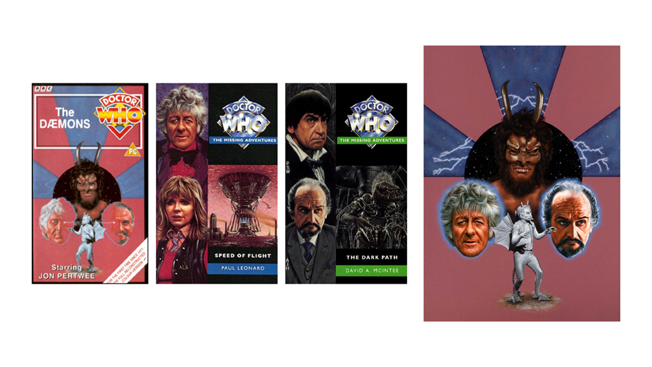 Old Fusionย is a collaboration between illustrator Alister Pearson and graphic designer David Lavelle, producing Special Editions of Alister’s popular book and video cover illustrations for the BBC’s Doctor Who television series. We digitally remaster the original art, and ‘remix’ with elements from other paintings in Alister’s extensive portfolio. In many cases we enhance the revamps with newly painted elements and digital renderings. The new artworks have been published as limited edition art cards, prizes given away as one-off prints to support charitable causes, and occasionally been included in CD sleeve designs for BBC Audiobooks’ ongoing series of Target novelisation readings.
