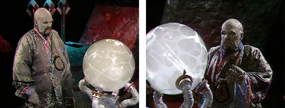 The scale of various elements were subtly altered to fit the new CD-width composition, which was further enhanced by new paintings of the seventh Doctor and some detail of the cliff face from the story’s location footage. Other enhancements included the new band of magenta light around the brain stand, extension and softening of the steam emitting from under the brain and an extension of the planet surface on the right edge.
